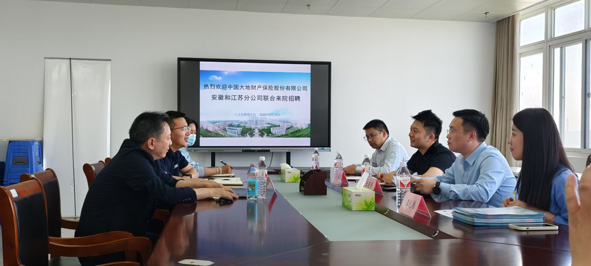 为加强与用人单位的联系,搭建毕业生与用人单位的交流平台,5月12日,申搏sunbet邀请中国大地财产保险股份有限公司安徽分公司和江苏分公司来院选用毕业生,公司党委副书记钱彬彬、保险学专业负责人俞彤以及相关辅导员参加会议。