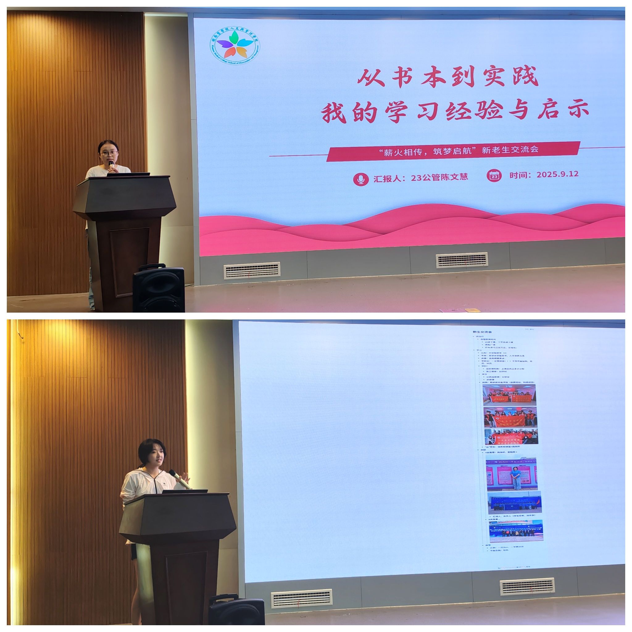 在干货满满的分享环节,学长学姐们倾囊相授:来自2023级公共事业管理专业的陈文慧以《从书本到实践:我的学习经验与启示》为题,通过生动案例诠释知行合一的真谛,鼓励新生跳出舒适圈,在志愿服务、课题调研中锻造综合能力;来自2023级应用心理学的金星月系统拆解科研竞赛全流程,从创新选题的灵感捕捉到团队协作的破局之道,再到成果展示的视觉化表达,为新生揭开了学术探索的神秘面纱。
