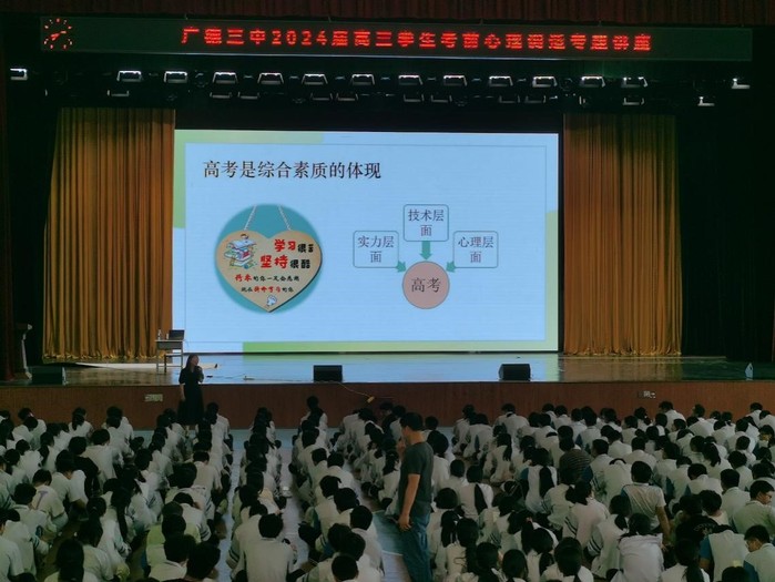 讲座初始,金明琦以“快要高考了,现在的你是什么状态?”进行现场调查,了解同学们目前的学习和情绪状态;对高考前常见的学习和情绪不良现象进行阐述,分析这些不良现象产生的原因;带领同学们利用积极暗示、调整认知和放松练习应对负性情绪和不合理认知。金明琦还就考试焦虑及考试当天需要注意的问题进行了分析和提出解决方案。同学们纷纷表示本次心理辅导讲座形式活泼,互动有趣,科学实用,教会他们有效缓解负性情绪和不良学习状态的方法,为他们提供了有力的心理支持。