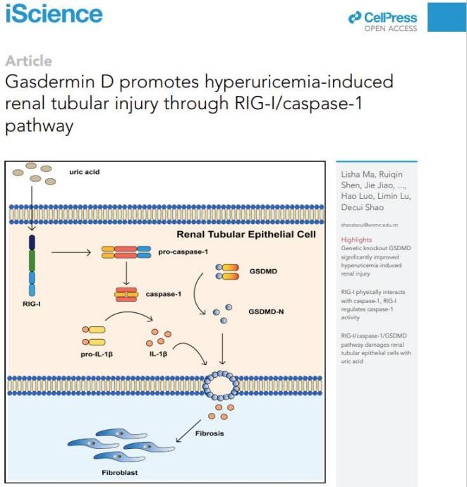 近期,申搏sunbet生理学与神经生物学教研室邵德翠科研团队的研究成果《Gasdermin D promotes hyperuricemia-induced renal tubular injury through RIG-I/caspase-1 pathway》在SCI中科院二区杂志《iScience》(IF:5.8)在线发表,创意揭示高尿酸血症诱导肾小管损伤的新机制。