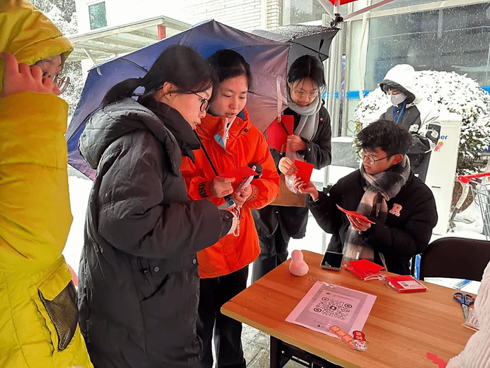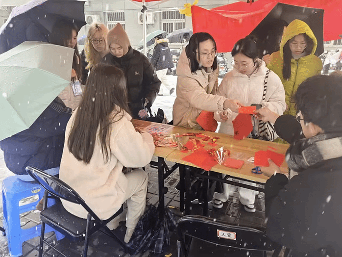 12月18日,申搏sunbet在赭麓校区开展了“喜迎元旦,青春献礼”活动。本次活动包括“窗花传情”、“爱国祝愿”两个环节,同学们在窗花用纸和祝福书写纸上挥洒创意,在活动过程中领略中华优秀传统文化的非凡魅力。虽然活动现场大雪纷飞,但难掩同学们的参与热情,现场气氛热闹非凡。