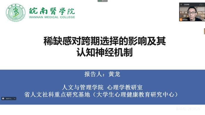 黄龙博士以“稀缺感对跨期决策的影响及其认知神经机制”为题作学术报告。报告梳理了客观稀缺对人类行为决策的影响和理论基础。随后,黄龙对本课题组最近开展的四个研究(6个实验)进行了详细的介绍,阐述了主观稀缺感对人类跨期决策偏好的影响,并结合问卷调查、行为实验、脑电实验等多种心理学研究方法揭示了主观稀缺感影响跨期决策的心理与认知神经机制。论坛中,黄宏平教授、国实副教授、徐爱萍博士等老师与黄龙就报告中的实验设计、研究方法、脑电数据处理、研究展望等问题进行了深入的探讨。整场报告思路清晰、内容新颖,取得了较好的学术交流效果。