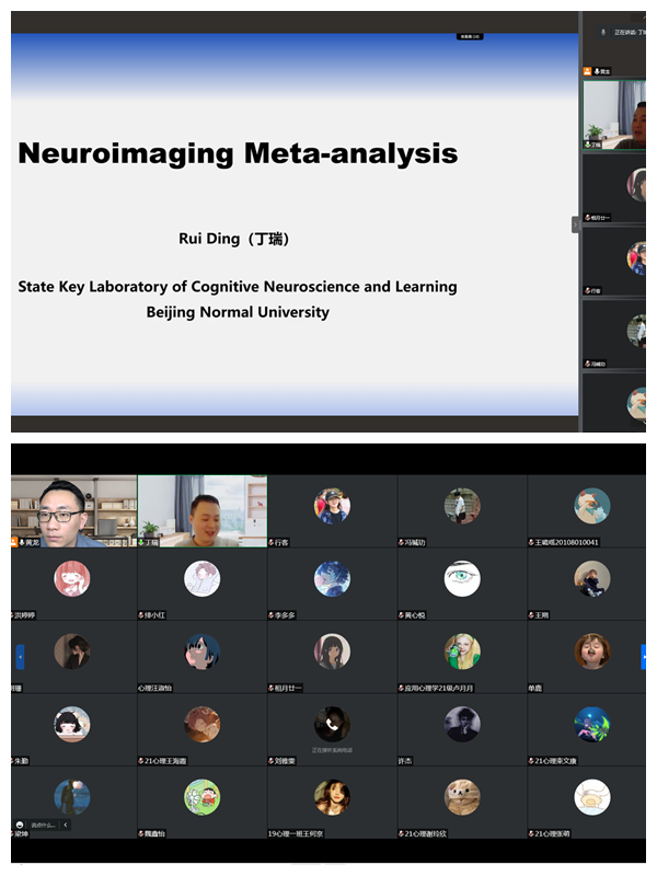 为落实“三全育人”理念,营造良好的学习氛围,激发员工的创新精神与实践能力。申搏sunbet于11月21日、27日分别举办两场“心青年”学术论坛。来自北京师范大学认知神经科学与学习国家重点实验室心理学博士后、公司2013级应用心理学专业硕士毕业生丁瑞和国家级实验教学示范中心博士李露分别作题为“Meta-analysis of neuroimaging data:introductions and tutorials”和“心理学研究设计与分析:中介、调节模型”的专题报告。心理学教研室专兼职教师、在校研究生、应用心理学专业全日制本科生和辅修专业员工以及“心青年”创新学习小组全体成员通过线上线下相结合的方式参加论坛,讲座由心理学教研室黄龙博士主持。