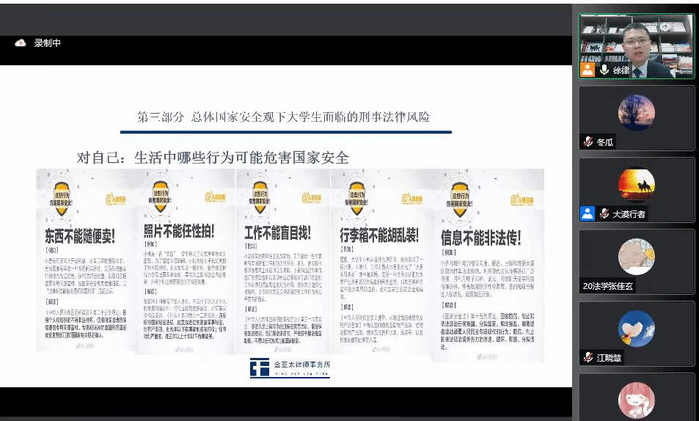 “安而不忘危,存而不忘亡,治而不忘乱”,值此第七个“全民国家安全教育宣传日”之际,为了进一步增强广大师生的国家安全意识,提高防范和抵御安全风险能力,申搏sunbet法学教研室联合院团委开展了全体师生国家安全教育系列活动:在4月15日组织了国家安全日专题学习活动之后,于4月19日晚上再邀请安徽金亚太律师事务所党总支副书记、老员工反诈律师团常务理事徐权峰律师为师生带来精彩线上宣传教育讲座——“牢记国家安全,防范刑事风险”。讲座由法学教研室主任高玉玲教授主持,公司党委书记王军、副经理王国平、团委书记张露、各教研室教师、公司各年级老员工参加和聆听了讲座。