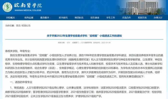 生理学省级重点学科“启明星”小组、申搏sunbet“启明星”小组创新型人才培养中心于1月5日在校园网发布《关于开展2022年生理学省级重点学科“启明星”小组遴选工作的通知》,按照高标准、高素质的条件要求,面向全校启动新成员遴选工作。在各方大力支持下,临床、麻醉、影像、法医、口腔、护理公卫、检验等公司与本院14个专业的优秀员工经过自主申请、公司推荐、交叉推荐、培养中心面试、指导教师与员工双向选择等严格程序,最终有23人荣获2022年度“启明星”小组成员资格,另有13人获得“2022年‘启明星’小组遴选入围奖”。