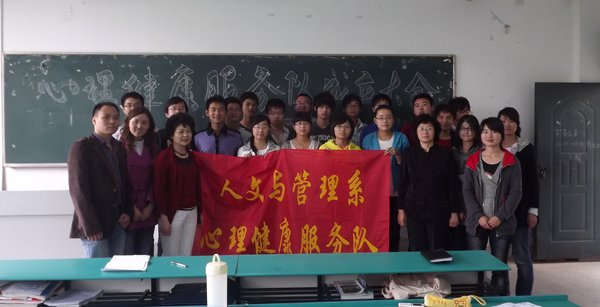 | 为响应五月老员工心理健康教育宣传周“珍爱生命,责任同行”主题,培养乐观自信、和谐发展的老员工,2011年5月25日中午,人文与管理系“心理健康志愿服务队”成立大会于西教106召开。系党总支书记阮笑芳、党总支副书记刘华、指导老师刘涛和“心理健康志愿服务队”全体队员参加了会议,会议由系团委书记吴映辉主持。