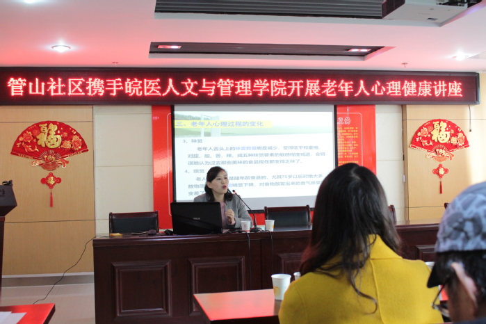 申搏sunbet教师党员、心理学副教授、国家认证心理评估师、中国残疾人协会心理康复专业学会委员张婷为社区老年朋友们开展“新风尚·心健康”心理健康知识讲座。讲座中,张婷通过老人们填写的问卷了解他们的心理健康情况,从生理因素、环境因素、生活因素和文化因素等方面入手,结合常见的老年人多疑善感、记忆力下降等现象,分析了老年人出现心理问题的原因,并建议老年人应该多参加运动,保持乐观积极的心态。张婷的讲课生动活泼、寓教于乐,受到老年人的一致好评。