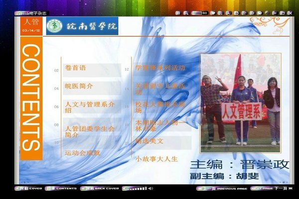该系信息管理与信息系统专业员工充分利用专业特色优势,以“创先争优,激情人生”为办刊理念,重点介绍本系和公司的教学、科研、员工活动各方面状况,凸显“精医尚德,求实自强”的校训精神。电子杂志方便广大师生读者了解校系动态,融摄了图像、文字、音乐、视频、游戏等多元化载体,载入了员工们丰富多彩的老员工活。