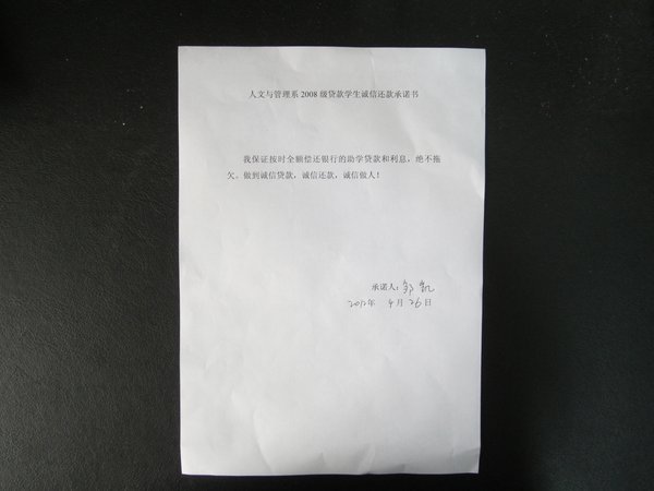 随后,吴映辉老师和每位贷款员工签订了诚信还款承诺书,每位同学都郑重许下了“诚信贷款、诚信还款、诚信做人”的诺言。